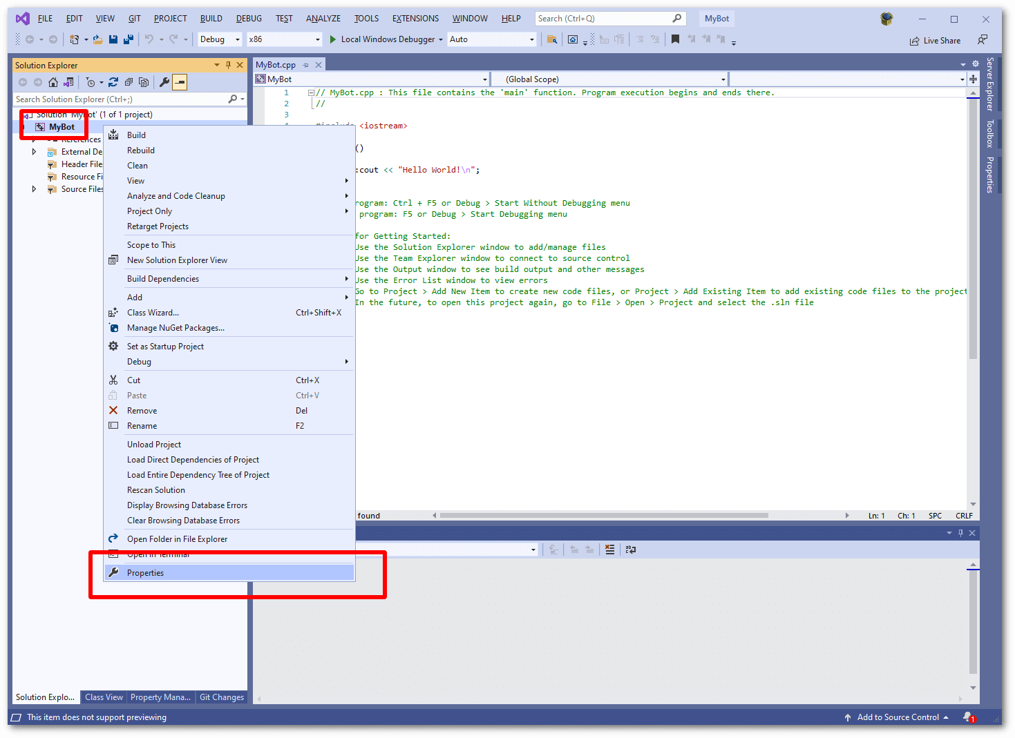 - Now you can paste some code into the editor, completely replacing the 'hello world' application that visual studio made for you. The example code here is the basic bot from the first example on this site. You should at this point also double check that the architecture you have selected (in this case x86) matches the version of the dll/lib files you downloaded from the website. This is important as if you mismatch them the compilation will just fail.