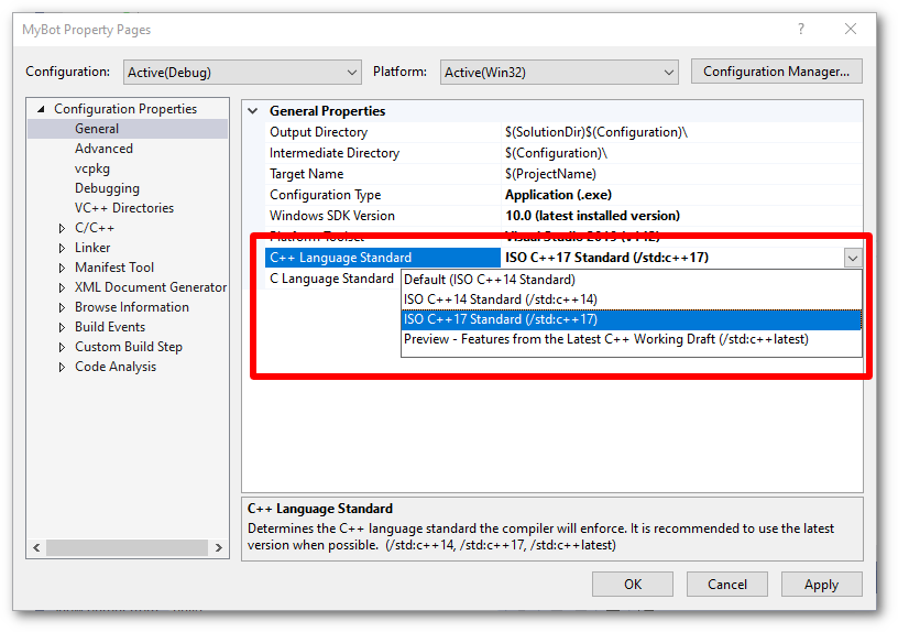 - Go to the general section in the same window now, and look for the drop down list laballed "C++ Language Standard". Make sure the selected option is C++17 Standard (/std:c++17)