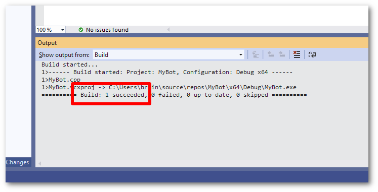 - Observe the build output. There may be warnings, but so long as the build output ends with "1 succeeded" then the process has worked. You may now run your bot!