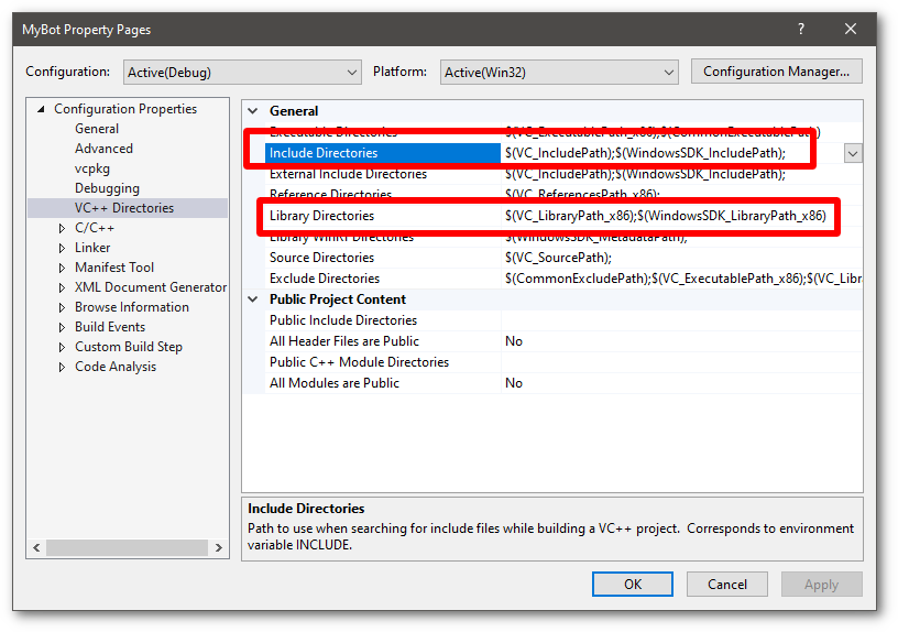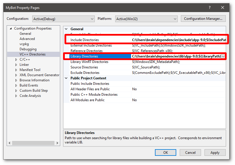 - The next step is to populate the include directories and library directories sections with the paths to the D++ library and include files. The next steps will guide you through how to do this.