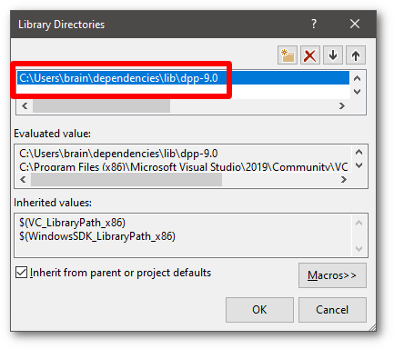 - Going back to the previous window, now edit the library paths. Again click 'edit' when prompted to edit the library paths section. Add the path to the library folder you extracted to your machine, which we took note of earlier. Note that once more it is important to add the dpp-9.0 folder within it, not any other folder, to this list. Also be aware this is a different folder than the one you just added for includes!